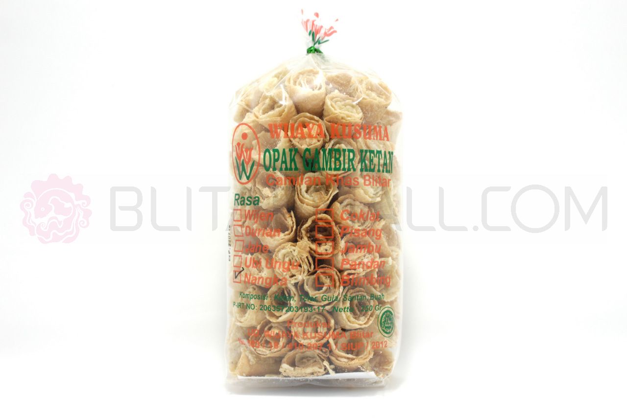 Jajanan Kue Kering yang satu ini mungkin sangat asing terdengar oleh kamu yang tidak tinggal di Blitar. Opak gambir ini merupakan sejenis kue kering khas kota blitar yang memiliki rasa manis dan gurih. Bahan dasar dari pembuatan opak gambir ini yaitu dari tepung terigu dan sari buah. Cara pembuatan opak gambir ini juga cukup sederhana yaitu dengan menggunakan khusus yangsangat panas dengan ketebalan yang tipis, sehingga sangat wajar jika tekstur dari opak gambir ini sangat renyah ketika digigit. Kebayang enaknya kan?? Pasti kamu pengen buru-buru beli kan??